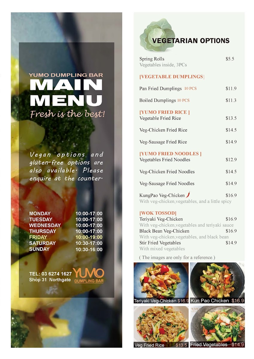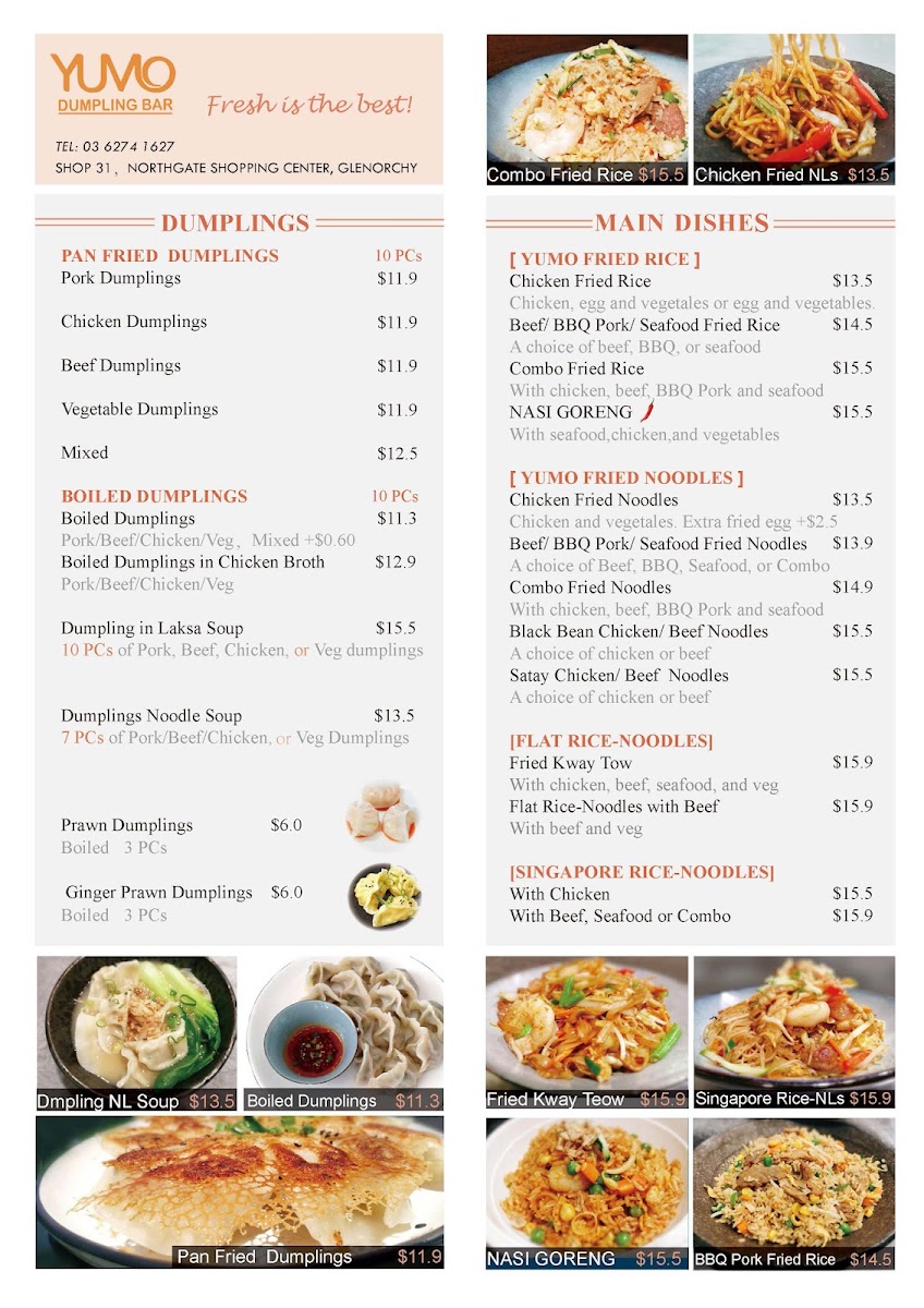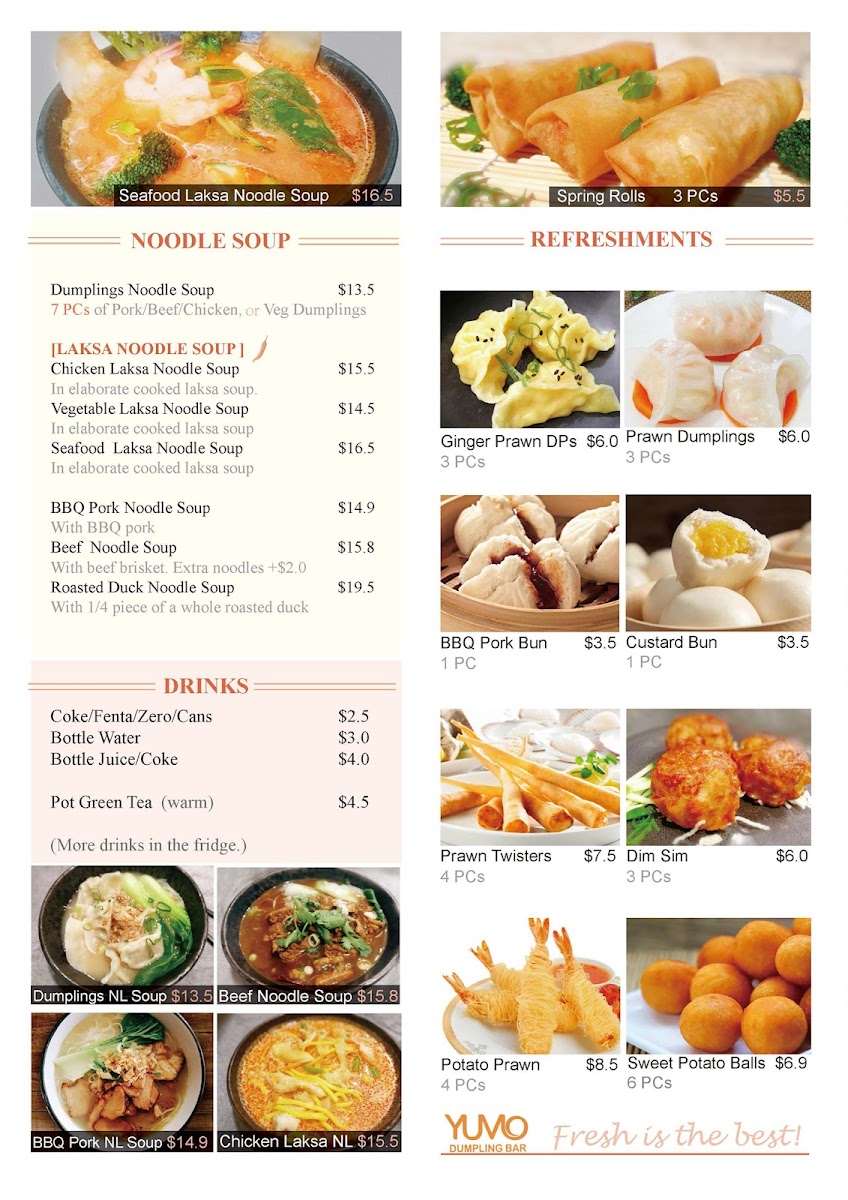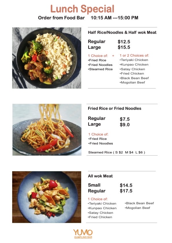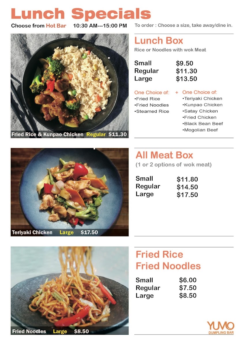 From a reviewer’s perspective, the menu at Yumo Dumpling Bar offers a satisfying variety of Asian comfort dishes that balance both flavor and familiarity. Standouts include the Honey Chicken, Sichuan Chicken, and Teriyaki Chicken, which highlight the versatility of their chicken stir-fry selection, alongside comforting options like Sweet & Sour Chicken and Green Curry Chicken. The noodle section is equally appealing, with favorites such as Fried Kwey Tow, Satay Noodles, and Yumo Fried Noodles, while heartier choices like Black Bean Beef Noodles deliver bold flavors. Dumpling lovers will appreciate the handmade range, especially the Chicken & Corn Dumplings, Beef Dumplings, and Pork Dumplings, offering a well-rounded tasting experience. Soups like the Chicken And Vegetable Laksa Noodle Soup and Seafood Laksa Noodle Soup provide rich, aromatic options, complemented by rice staples such as Yumo Fried Rice and Steamed Rice. Entrées like Egg Custard Bun, Spring Rolls, and BBQ Pork Bun X 2 add a delightful start to the meal, while simple beverages like Coke Can and Sprite Can round out the offering. Overall, the menu feels diverse and approachable, though the absence of clearly listed prices makes it slightly less convenient for quick decision-making.